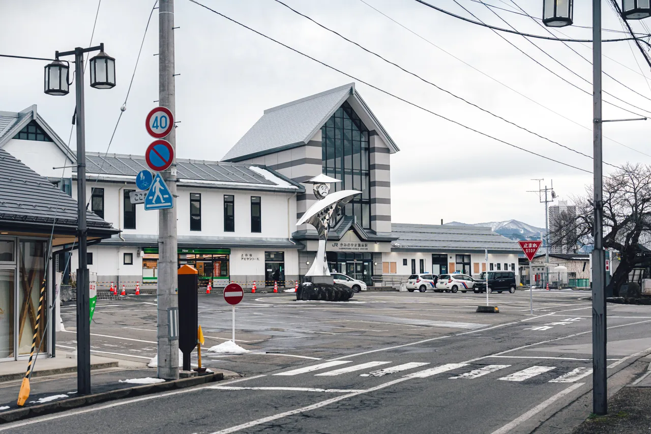 米沢、赤湯。通過する駅ごとに広がるのは、見渡す限りの銀世界。「東北の冬は、やはり格別だ」とその雪の多さに圧倒されていましたが、いざ「かみのやま温泉駅」に降り立つと、そこには雪のない乾いた路面が広がっていました。予想外の光景に逆に驚きましたが、街の至る所に貼られた「加勢鳥」のポスターを目にしたとき、明日始まる熱狂を静かに告げられているような気がしました。